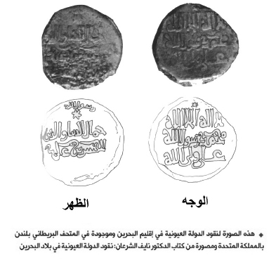 [186]ـ وهو دليل الرخاء في تلك الفترة’، هذه النماذج من النقود موجودة في المتحف البريطانيّ بلندن، وقد عرضها نايف الشرعان في كتابه «نقود الدولة العيونيّة في بلاد البحرين»، نشر هذا الكتاب مركز الملك فيصل للبحوث والدراسات الإسلاميّة، وتوجد صور للنماذج في هذا الكتاب).