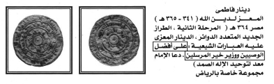 وقد ظهرت هذه العبارة على نقود الدولة الفاطميّة لأوّل مرّة على نماذج من نقود الخليفة المعزّ لدين الله، وذلك بكتابات الهامش الأوسط من نصوص وجه بعض الدنانير الذهبيّة المضروبة بمدينة المنصوريةّ في أعوام 343هـ[104]، 344هـ[105]، 345هـ[106]،346هـ، 347هـ، 348هـ، 349هـ، 351هـ، 352هـ، 353هـ، 354هـ.