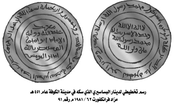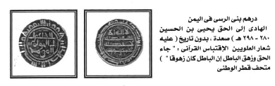 والرسيين[71] وإبراهيم بن جعفر العلويّ في اليمن[72]. فقد أسّس الأئمّة الزيديّة (بنو الرسي) دولتهم في صعدة في الربع الأخير من القرن الثالث الهجريّ وضربوا نقودًا ذهبيّة.. وهي في الغالب نقود محلّيّة سجّلوا عليها منذ عهد الهادي إلى الحقّ نسبهم إلى رسول الله بعبارة (ابن رسول الله)، وكذا الآية الكريمة (جَاء الْحَقُّ وَزَهَقَ الْبَاطِلُ إِنَّ الْبَاطِلَ كَانَ زَهُوقًا)